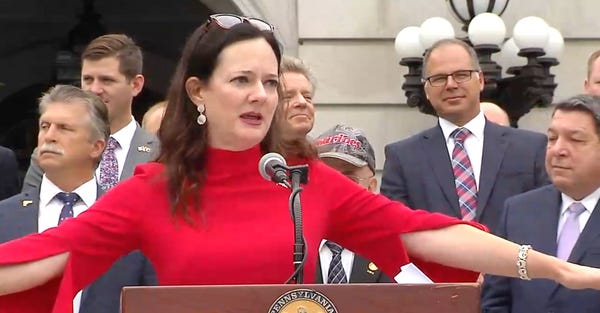 This woman loves the fire and brimstone act. Back in 2019, she opened a voting session in the state House with a prayer about how "at the name of Jesus every knee will bow and every tongue will confess, Jesus, that you are Lord." ( Her version of Jesus definitely would've drunk from a blinged-up Holy Grail. ) This was shortly before Democratic Rep. Movita Johnson-Harrell, the first woman Muslim member of the Pennsylvania House, took her oath of office. I doubt the timing was coincidental.