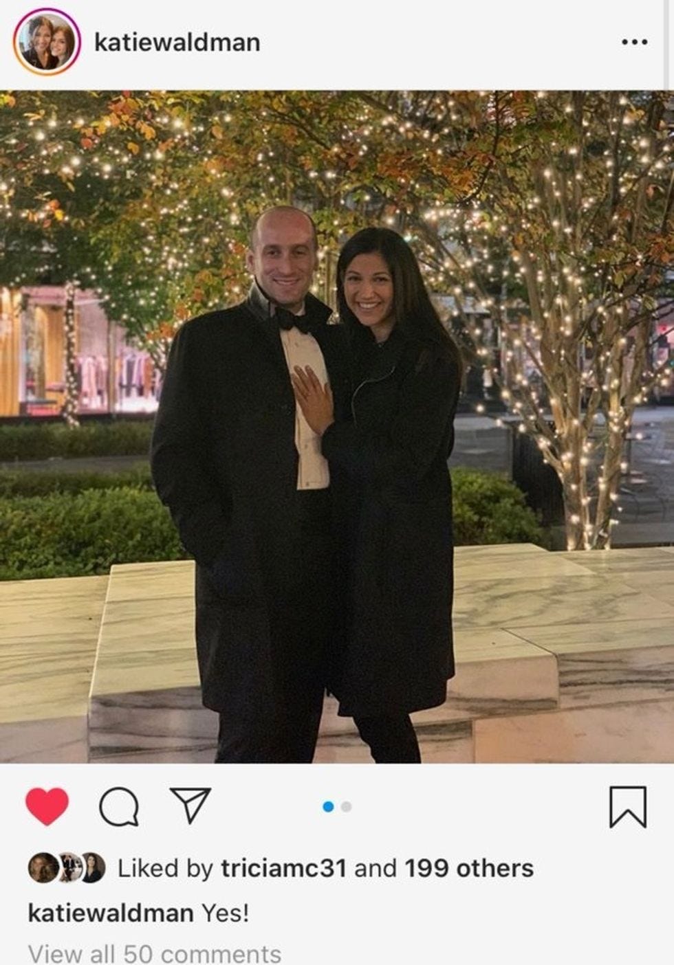 Stephen Miller, Donald Trump's undead vampire immigration Gauleiter , is apparently engaged to marry Katie Waldman, who in September became Mike Pence's press secretary after two years talking up the administration's brilliant work on immigration as a press flack at the Department of Homeland Security. Waldman posted the news on her private Instagram over the weekend, after which it was reposted to the Twitters by former Obama DHS and Defense official Todd Bresseale: