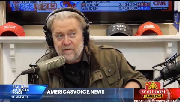 That wasn't it for Steve Bannon yesterday, either. He was also on the "faithless electors" train, reassuring Trump voters that Trump actually won the election on Tuesday, but also they still have a month to steal it anyway, because Republican legislatures can just tell their electors to vote for him.