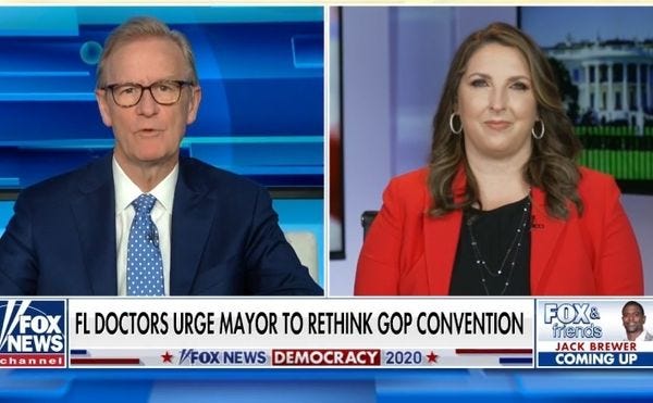 Doocy broached the topic while chatting with Republican National Committee Chair Ronna McDaniel, who, having shed her familial connections to Mitt Romney, knows a thing or two about making changes for the sake of messaging. Now that the city of Jacksonville, Florida, is requiring masks be worn in public, McDaniel said she's fine with complying with city mask orders, even though the GOP moved its national convention to Jacksonville so it wouldn't have to face Democratic Health Tyranny in North Carolina.