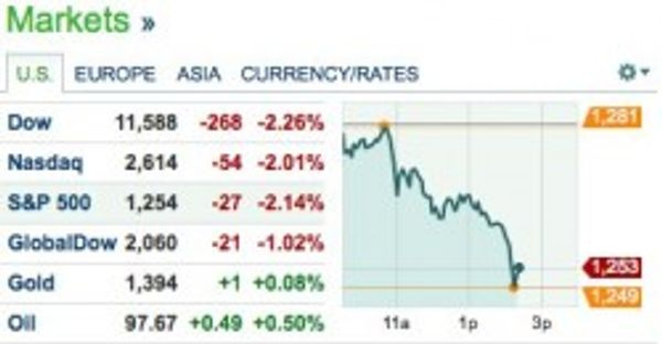 Did everybody enjoy the "jobless recovery" of the past two years? Because, uhh .... The American stock markets plunged more than 2% today as everybody freaks out about the dismal housing numbers, the continuing craziness in oil-producing Middle East/North African nations, another round of the European debt crisis and (of course) the nuclear horror show unfolding in Japan, the world's second-biggest economy. Second or third, we can't remember if China officially took over that spot before the earthquake. Third! For now .... Anyway, la la la la la.