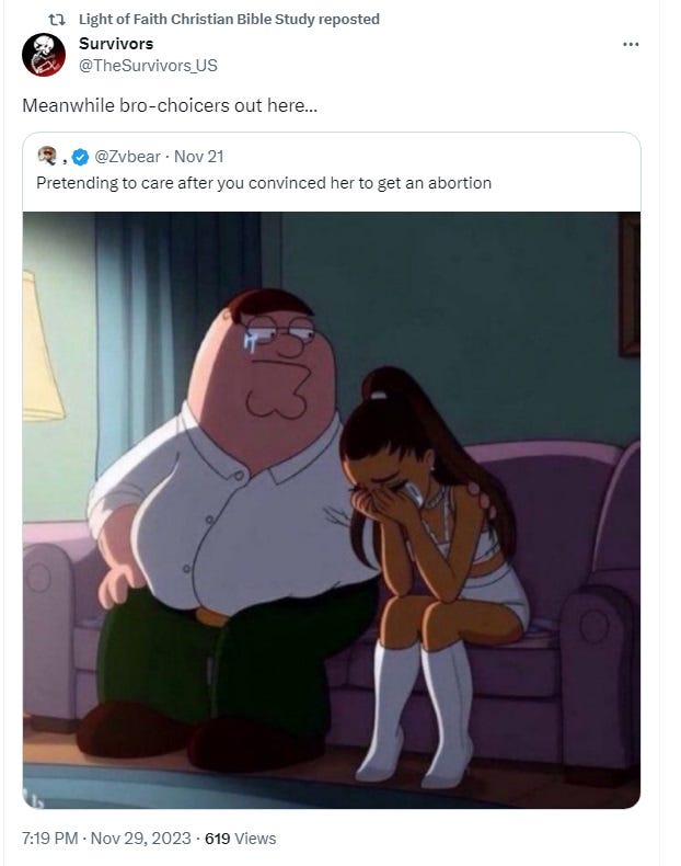 Also I learned from this exercise that some hip young forced birth advocates call their enemies “bro-choicers,” because terrible men force women to have ‘bortions so the men can have all the sex they want with no consequences. Here is an example, along with a poignant dig at The Family Guy for making cartoon Ariana Grande have an abortion and we just don’t understand what is in these weirdos’ heads, yikes: