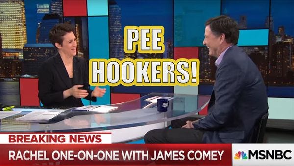 Last night James Comey was talking with Rachel Maddow when the memos dropped, and she pressed him on THE DOSSIER, their joking about jailing reporters, and how Trump's defense of the pee hooker tape stems from a phone call with Putin where he claimed that Russia had "some of the most beautiful [pee] hookers in the world." [ Morning Maddow ]