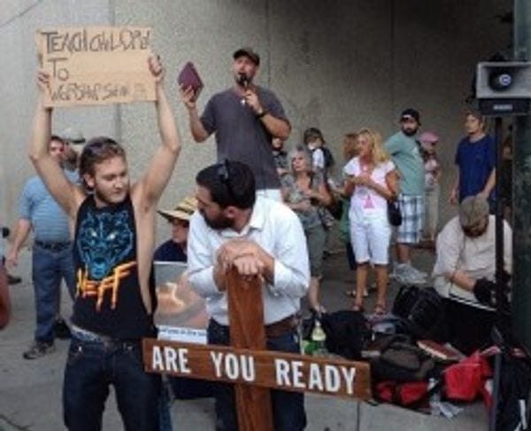 Somehow, we completely missed the news that Asheville, NC, is one big reeking "cesspool of sin," according to State Sen. Jim Forrester, one of the chief backers of that state's idioticban on gay marriage and all civil unions. But apparently hordes of street evangelists heard about it, and so they descended on Asheville's annual Belle Chere music and arts festival to save some souls. Astonishingly, many of the filthy hippies attending the fair did not take very kindly to being told they were going to hell, leading to scenes of lewdness, depravity, and gleeful trolling (for example, the handmade sign above reads "Teach Children to Worship Satan" -- it's a worthy effort, though we've seen better ).