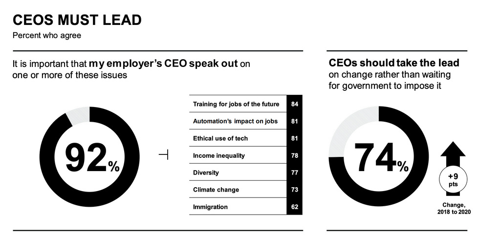 While people everywhere are more skeptical about capitalism in general, 92 percent of respondents said they also now expect businesses and CEOs to do more about issues like diversity, income inequality, and the environment.