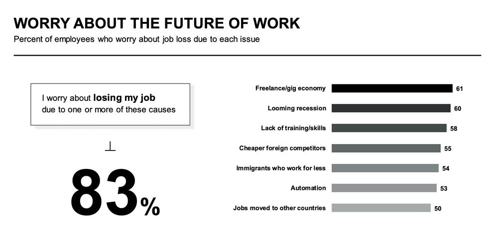 Also pretty interesting — a larger percentage of people are worried about losing their jobs to the gig economy, a looming recession, and cheap foreign competitors than are worried about losing them to immigrants.