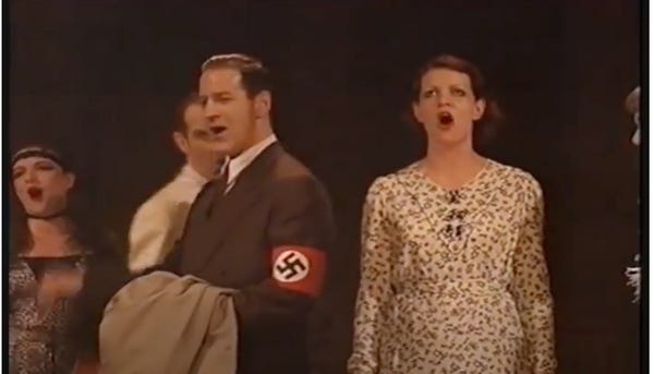 Weimar-era Germany was marked by high inflation and crushing poverty. People were literally starving to death on Berlin streets. Nazis didn't have actual solutions to these problems, but they knew who to blame. That's a familiar fascist tactic. Critics of the 1972 Bob Fosse film of Cabaret, which I nonetheless adore, argue that Fosse ignored these grim economic conditions and overly glamorized the period. In most stage productions, Fräulein Kost represents the confluence of genuine "economic anxiety" with seething cultural resentment. Her immediate bond with the more "respectable" Ludwig is a prescient reflection of the MAGA movement.