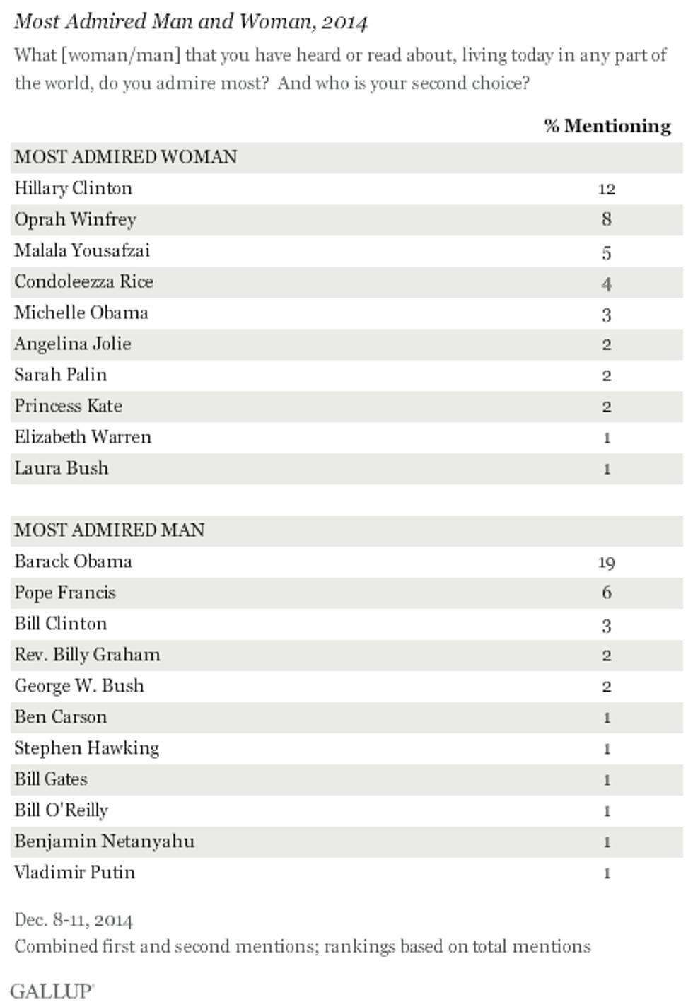 I find them deeply confusing. If I'm guessing at the methodology correctly, the percentages represent the sum of those who were chosen "most admired" and those who were chosen "second-most admired". Okay so far.
