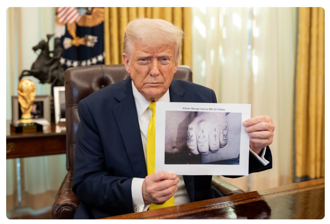 But in this blog post, we’d like to focus on the truly mindnumbing exchange Trump — in olden days, Trump might’ve been called the “leader of the free world,” but it’s increasingly clear this befuddled dipshit is leading a whole lotta nothin’, much less any part of the “free” world — had with Moran, over whether the fake, Photoshopped picture he posted of Kilmar Abrego Garcia’s nonexistent “MS-13” hand tattoo was Photoshopped. (It was.)