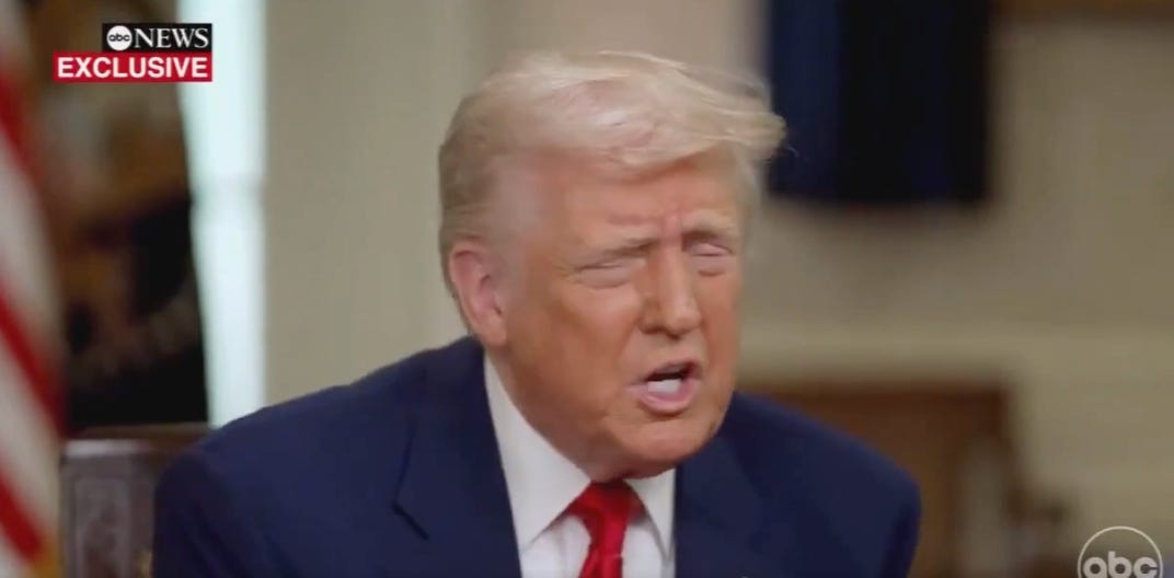 Much will likely be made of Donald Trump’s ABC News interview with Terry Moran last night, part of Trump’s 100 Days, One Idiot tour of interviews celebrating his hundredth day fucking America without its consent. For instance, he said Moran didn’t know what his tariffs would do to the price of goods from China, because “You don’t know whether or not China’s going to eat it.” He added, “China will probably eat those tariffs.”