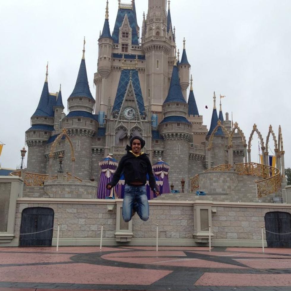 So now that we've established that Abdul Rahman Ali Alharbi is a SAUDI NATIONAL who is being "guarded by federal agents," let's see how scary this guy is! Hoft includes some terrifying photos from the kid's Facebook page. Here we see a very threatening brown person jumping up in the air (like 9/11!) in front of the castle at Disney World (no doubt during a recon mission!):