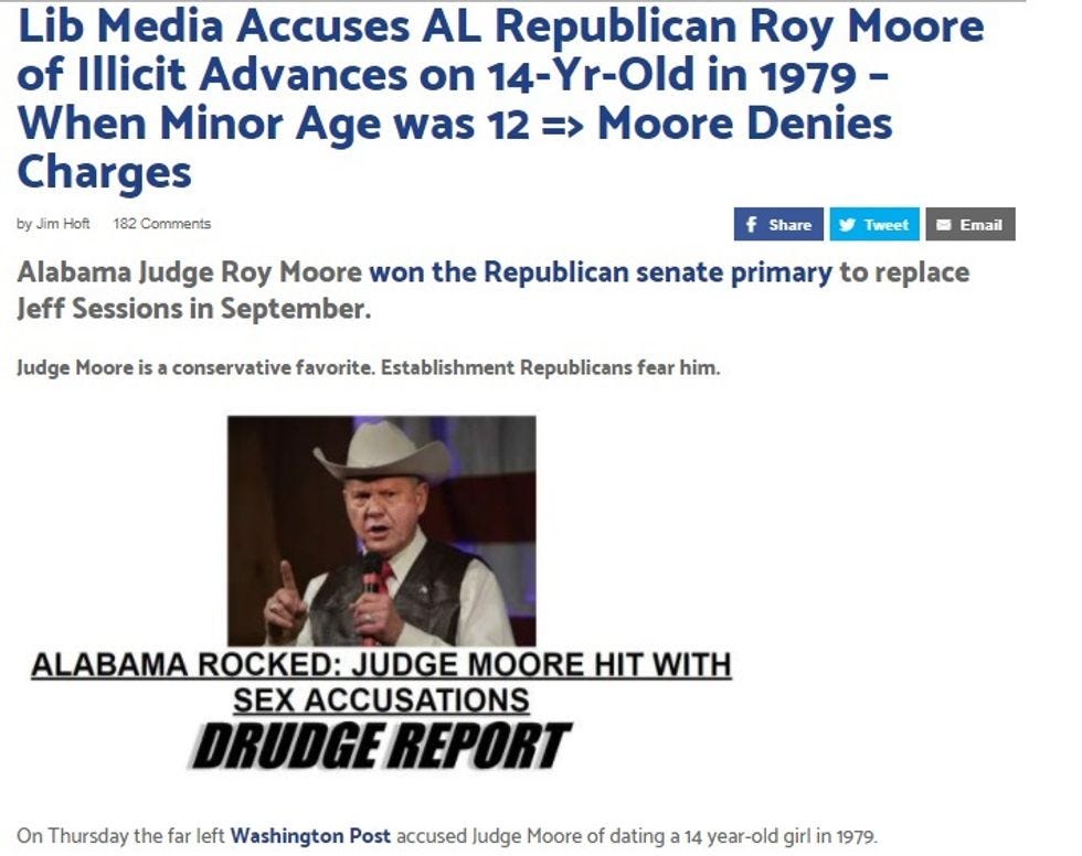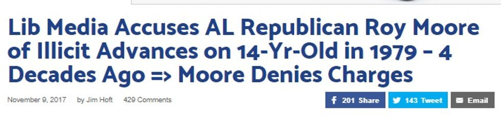 Yes, he actually said "dating." Which we suppose is perfectly accurate as long as you don't mention what Leigh Corfman says happened on their second "date." In typical Hoftian fashion, the piece blockquotes several paragraphs from the WaPo story -- but only the part about Moore meeting Corfman and her mother outside a courtroom, not the explicit details of his taking off her pants and top and touching her outside her bra and panties and trying to put her hand on his peener. Perhaps Hoft was simply trying to keep it clean for his family-friendly blog. After citing Moore's angry denial, though, Hoft drops this bit of (erroneous) wisdom, which remains in the current version of the article: