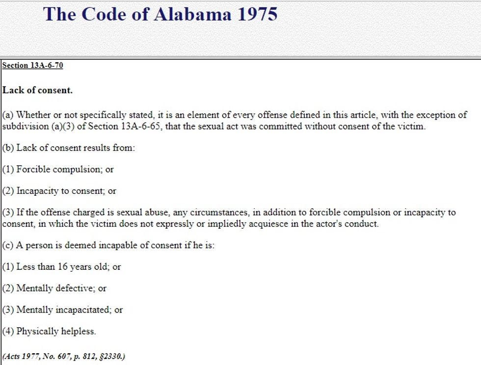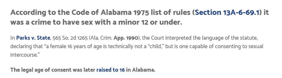 Now, where the hell does he get the idea that the age of consent in Alabama in 1979 was 12, not 16? He cites Alabama statute, but the relevant 1975 code he mentions explicitly lists 16 as the age of consent; it was not "later raised to 16":