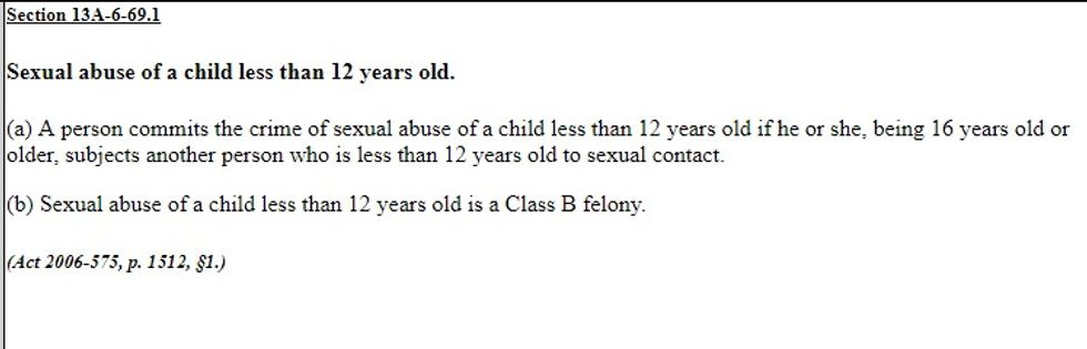 Now, we think we've found the hair-splitting that Hoft is pretending means a 14-year-old girl was not actually a "child" in 1979. In the statue defining second degree sexual abuse, Section 13A-6-67, the offense is defined as a Class A misdemeanor, and applies to anyone who "subjects another person to sexual contact who is less than 16 years old, but more than 12 years old." See? It's person, not child!