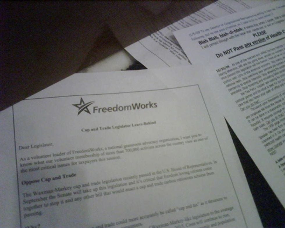 We all know that the whole point of yesterday's affair was to throw trash around the House office buildings and get arrested and maybe do meth at some point. Much of the trash, however, was from Dick Armey's "astroturfing" organization, FreedomWorks, which pretends to give a shit about these angry wingnuts' lives. Our Hill operative sent this picture and added, "our office just got teabagged with their lobbyist paid-for trash." Many more offices suffered a similar fate, of a bunch of know-nothing jackasses trashing their offices with rich lobbyist Dick Armey's fever dreams.