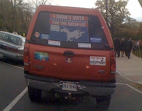 Wonkette motorist operative "Marcus" sent us this telephone picture of the rather uncouth car he was stuck behind yesterday, during the Super Bowl of Retardation. This fellow hates Obama so much that he -- and we're presuming "he," because how unladylike! -- chose to attach a massive cut-out of a donkeyshittingObama's head on his rear windshield, at the expense of his visibility. Another sticker reads, "King's Dream is a Nightmare." Oh that sillyMartin Luther King Jr.,always ripe for a joke. After the jump, another wacky leftover operative photo, from a Hill office.