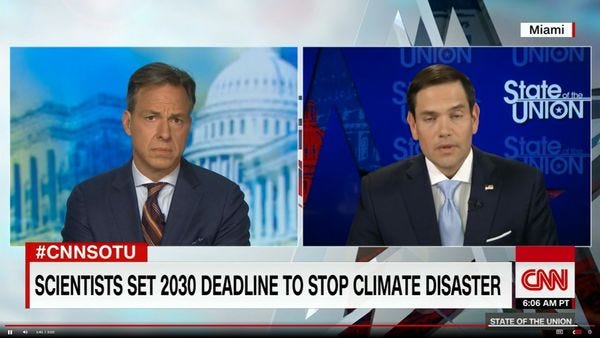 Appearing on CNN's State of the Union with Jake Tapper, Senator Marco Rubio of Florida was asked about climate change and its effect on intensifying storms like Hurricane Michael or rising sea levels in Florida. Rubio began by admitting climate change was real: