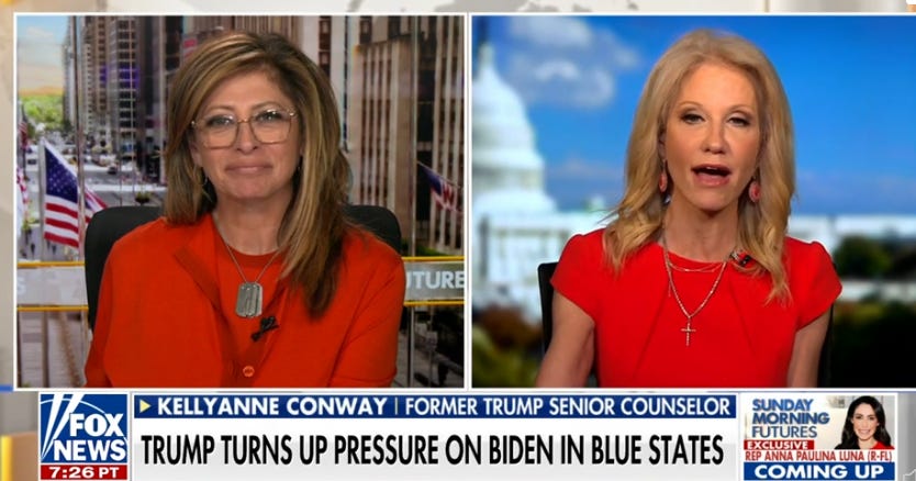 Normally we don’t cover Fox Business’s MAGA Funhouse “Sunday Morning Futures” with Maria Bartiromo, but some things cannot go unmentioned. This time it was former Trump senior counselor and professional liar extraordinaire Kellyanne Conway.