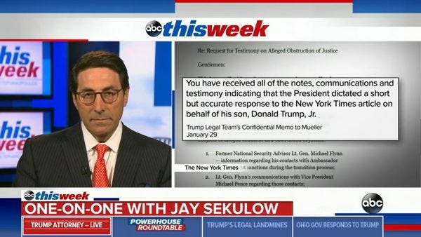 Appearing on ABC's " This Week with George Stephanopoulos," Sekulow had to explain the complete destruction of his defense of the infamous Trump Tower meeting: