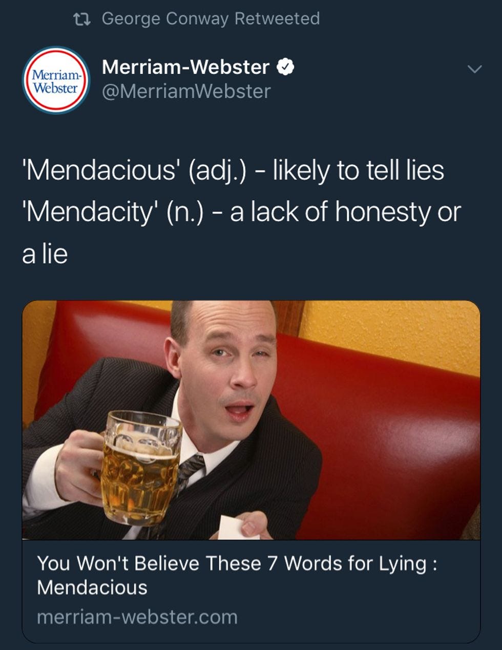 That's very rich coming from the creator of alternative facts and the Bowling Green Massacre, as well as someone who has worked with Donald Trump and Ted Cruz! That's like bowling perfects strikes in lying. In fact Conway's ability to sell a shit sandwich to rubes is her greatest strength, as exemplified by this old Jimmy Kimmel clip with Samantha Bee: