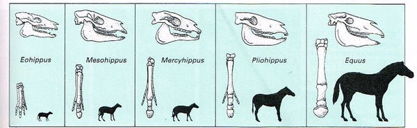 Wow, pretty compelling! Except for the teensy detail that, sorry, Eohippus and Equus didn't live at the same time, although that discredited assertion has been around since the 1930s. And then, with a collection of evolutionary steps between Eohippus and Equus sitting right at the top of the page, the text pretty much holds out for Zeno's paradox: