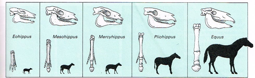 three toes on each hind foot. Other extinct animals have been lined up with progressively larger bodies and with foot structures more like that of the horse to form an evolutionary "path."
