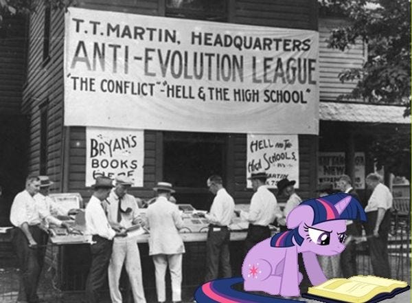 Hey there, history fans -- time for another trippy trip back in time to the 1920s, that thrilling decade that brought us wacky fads like raccoon coats, bathtub gin, and Christian fundamentalism. This week, we'll take a look at the 1925 Scopes "Monkey trial" and the religious infighting that helped propel it to national headlines. Of course, we'll be looking at it through the lens of two rightwing Christian textbooks aimed at the private school/homeschool market, so you may want to want to pursue some reliable reading as well.