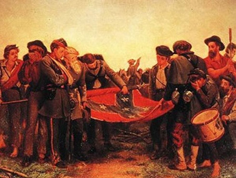 When the proud and sensitive sons of Dixie came to a full realization of the truth that the Confederacy was overthrown and their leader had been compelled to surrender his once invincible army, they could no longer control their emotions, and tears ran like water down their shrunken faces. The flags which they still carried were objects of undisguised affection. These Southern banners had gone down before overwhelming numbers, and torn by shells, riddled by bullets, and laden with the powder and smoke of battle, they aroused intense emotion in the men who had so often followed them to victory. Yielding to overpowering sentiment, these high—mettled men began to tear the flags from the staffs and hide them in their bosoms, as they wet them with burning tears.
