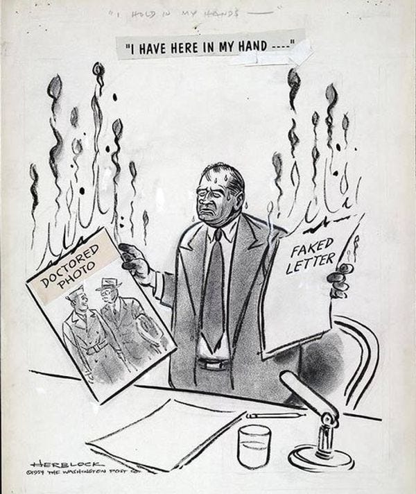 Dude was on a mission, and J. Edgar Hoover even backed McCarthy up and "revealed" that some government employees got security clearances "even though the FBI warned of their Communist activities." Strangely, however, the book doesn't mention any prosecutions of these probable traitors.