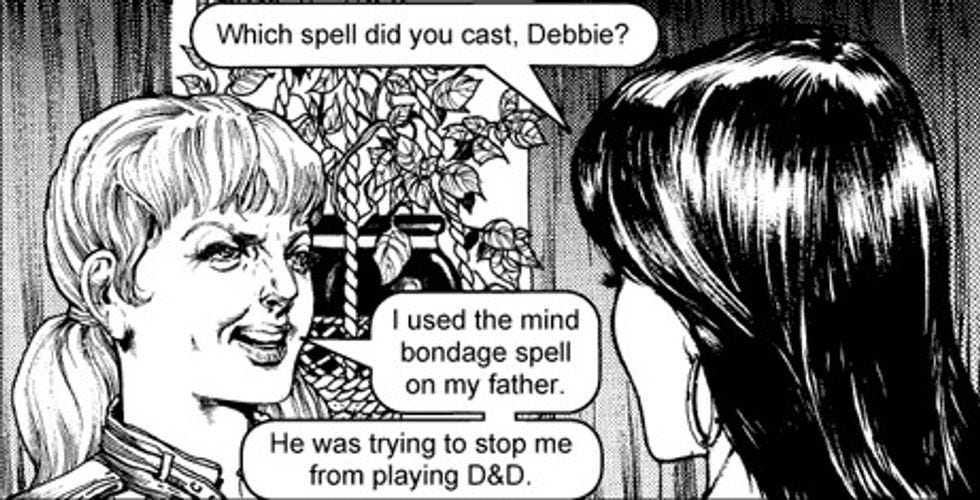Yes, Jesse is haunted by boobies and worried he might accidentally summon a demon, and as he speaks of the Bible, his anime eyes get bigger and more lustrous. Also, let's hear it once more for the writer's unfailing ear for teen dialogue: "Wow! That's some tight stuff!" made us feel like we were actually hanging around with some real teenagers from a Christian comic. Also ALSO: From a game design perspective, we're having a hard time figuring out how you'd wedge an Ouija board (a trademarked product of Hasbro) into the mechanics of a fantasy roleplaying game. It's a 20-sided die or die, man. We never find out exactly what this game looks like, since Jesse leaves before the game gets going -- but not without a wall-of-text discussion of the spiritual risks of messing around with occult stuff.