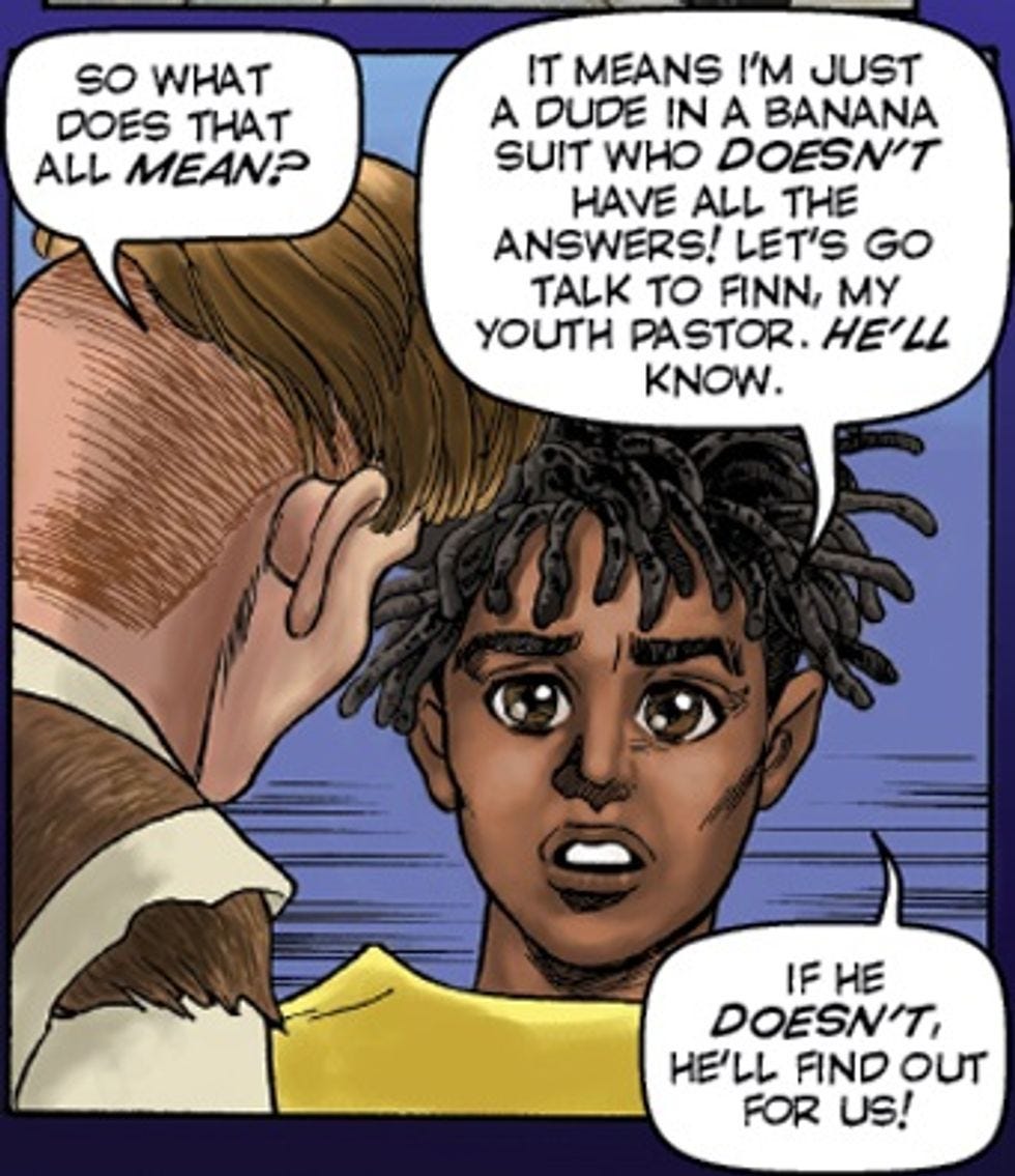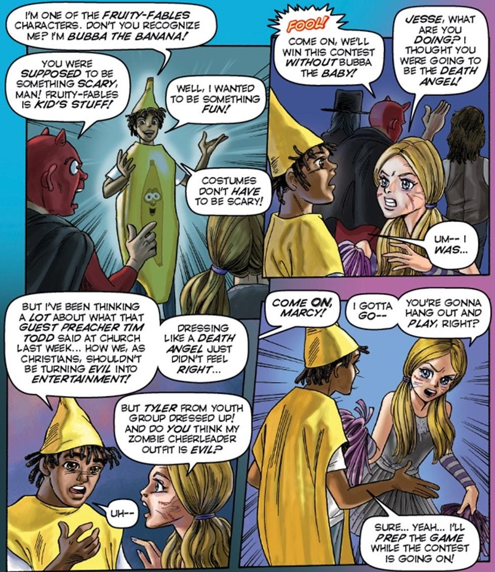 When it comes to the really big questions, aren't we all just dudes in banana suits who don't have all the answers? No Chick comix hero would admit to such doubts, but Jesse has to, so Finn, his youth minister, can deliver another Wall O' Biblical Facts. He congratulates the boys for coming to see him right away (Jesse has removed his banana outfit, however), and confirms Jesse did the right thing, even though he had to face martyrdom for it, because "Anyone who speaks to evil spirits or practices witchcraft is detestable to the Lord! (Deut. 18: 9-12)" And yet there he is, speaking with footnotes like some kind of necromancer himself.