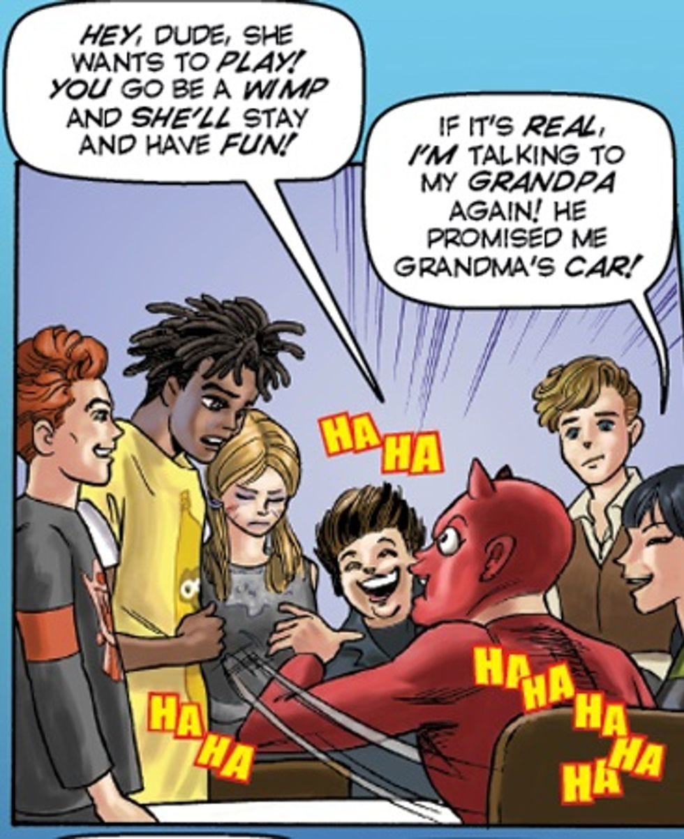 The kids' laughter lacks the demonic donkey-braying of a Chick comic's "Haw-Haw-Haw," but it still stings. As he's leaving, though, Jesse is intercepted in the hallway by his friend Austin, who was dressed as a werewolf and was completely silent during Jesse's trials -- not because he was a rank hypocrite who wouldn't stand up for Jesse (though he totally was, the hypocrite) but because Jesse's words have moved him. Does Jesse really think all this stuff is real? Jesse says demons and spirits are in the Bible, and the Bible is real -- "All of it!" -- so of course demons and spirits are nothing to joke around with. But he won't claim to have all the answers: