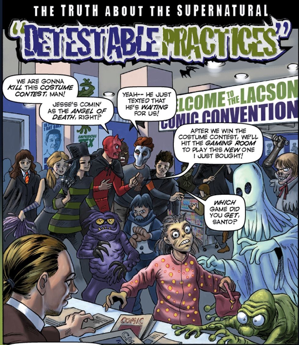This being the lamest comics convention ever, the kids win the costume contest, hooray! One girl jokes that she had "cast a spell on the judges, Bwahahahaha!" but again, this is no Chick tract -- she doesn't have the Obvious Demon Face of the truly posessed: