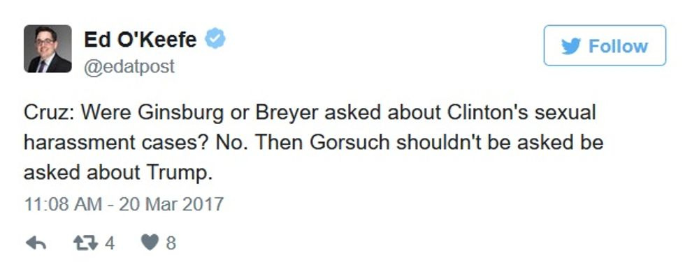 That's all in the past, though, according to virtually every Republican, including the loathsome ambulatory sack of lies and pus that goes by the name Ted Cruz, who explained Gorsuch actually had "super-legitimacy" thanks to the Republican refusal to hold hearings for Garland last year. You see, since he was chosen by a president who was elected by the American people in an actual election last year, rather than chosen by a president who had been elected twice but was in (barely) the final year of his term when Scalia died, that gave Gorsuch extra-special legitimacy as a candidate, and it would be terrible, just terrible, were Democrats to oppose his speedy confirmation. The New York Times reminds us that Cruz was among several Republicans who last year argued it would be perfectly normal to refuse to fill the seat on the Supreme Court for four years had Hillary Clinton won the election. Also, Cruz offered this bit of genius about why it's totally unfair for Democrats to even mention Donald Trump and his potential for judicial entanglements during these hearings, the monsters: