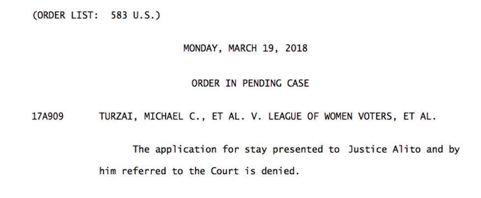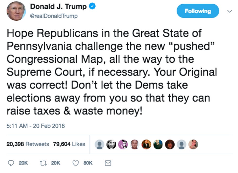 Would you stop looking at Don Junior's girlfriend for 10 seconds you pervs! We actually found you a NiceTimes post! Remember that Pennsylvania gerrymandering case where the state Supreme Court tossed their fakakta districts for violating the Pennsylvania Constitution? And then the Republican legislators rolled around on the floor in a pile of their own tears and waste refusing to redraw the districts and vowing to appeal to every court in the land and even God on High? Then the President jumped on the pile just for extra orange funsies?