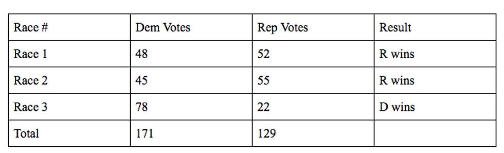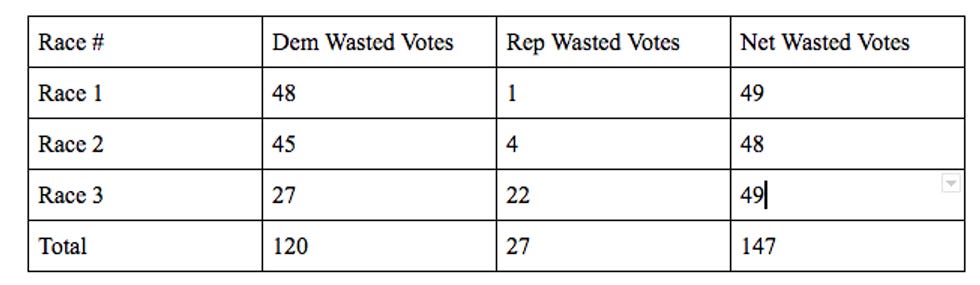 In the two Republican districts, Democrats wasted a lot of votes on their losing candidates, where Republicans voted efficiently -- they got their guys over the finish line without a lot of surplus votes. In Race 3, the Democrats only needed 51 votes to win, but they got 78. So across the state, Republicans wasted only 27 votes, while forcing Democrats to waste 120.