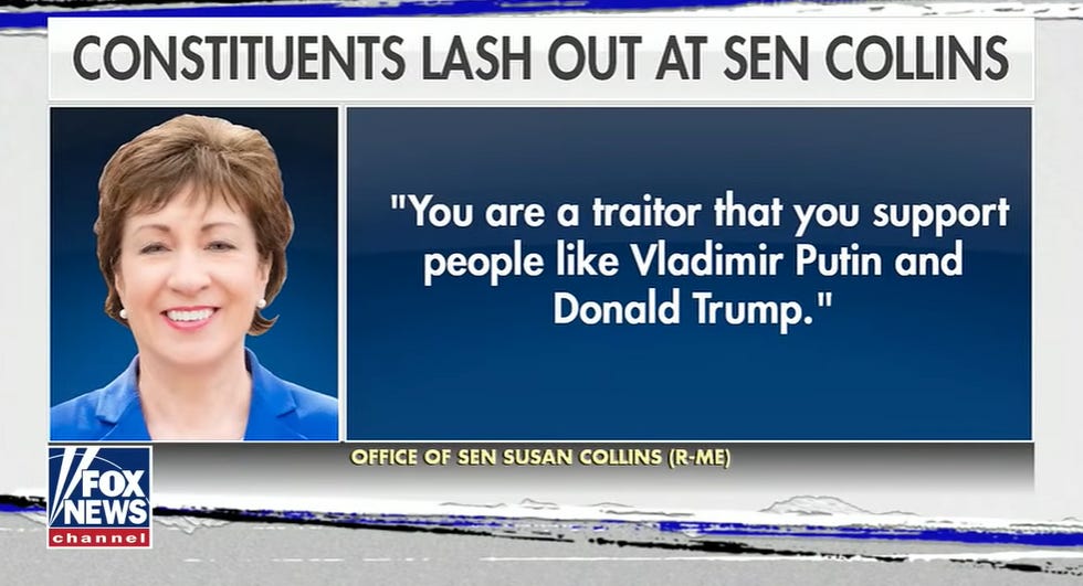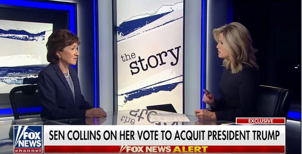 After Collins decided to be one of the 52 Republican senators to endorse Trump's abuse of power and one of the 53 to endorse his obstruction of Congress, she scampered off to Fox News to explain her upsets. The important part of the interview with Martha MacCallum starts about six minutes in: