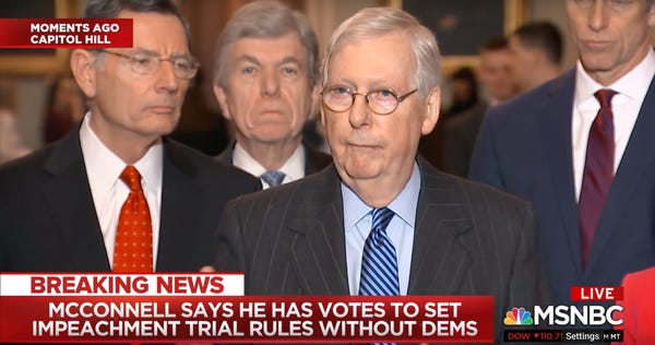 There are no "honorable" Republicans. Let's just get this out of the way. Anyone who believes otherwise should go kick footballs with Charlie Brown. Mitch McConnell declared Tuesday, between fits of maniacal laughter, that he has the votes to ensure a smooth sham impeachment trial for Donald Trump. It wasn't narrow. There were no "noble" holdouts. He has the support of all 53 members of his caucus.