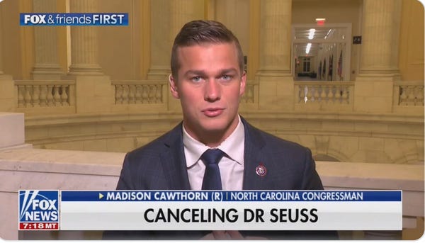 Thau probed further with specific instances of cancel culture and OMG, it's hilarious how silly they all are. He's asking people with bills to pay about Dr. Seuss, J.K. Rowling, Gina Carano, Mike Lindell, Goya Foods, and the white power primetime lineup on Fox News.