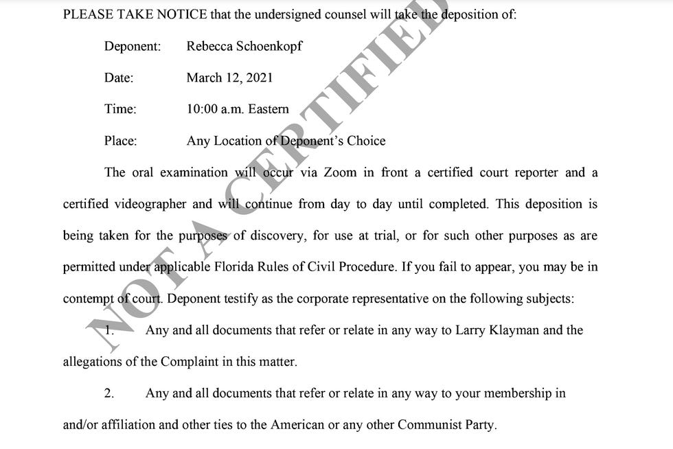 Okay, just one thing. I just learned on the clerk's website that before we won our motion to dismiss in Ten Things We Are Allowed To Say About Larry Klayman As Ruled On In A Court Of Law By This Nice Judge, apparently I was to be deposed with the pertinent question: AM I NOW OR HAVE I EVER BEEN A MEMBER OF THE COMMUNIST PARTY.