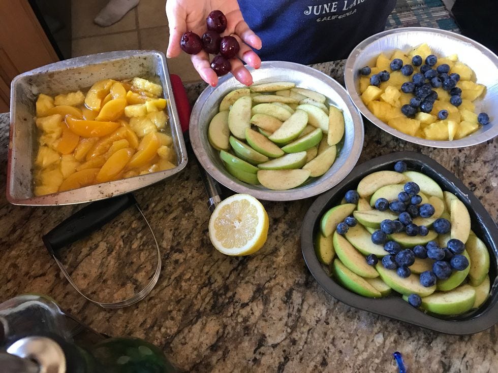 A) If apple, add some lemon juice, sugar, vanilla, cinnamon, nutmeg, cardamom; if all the other ones, you don't need the lemon juice PROBABLY, who can say? B) buy a pastry cutter to cut the butter into the flour and sugar instead of using the "two butter knives method," because it is not the 1950s, you should not have to suffer; C) oh, butter your pie plates! and bake at 350 for 30 minutes and then check to see if it's browned or not, if it's not, bake it some more!
