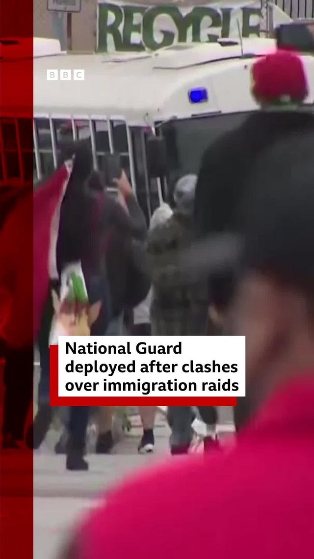 The fight for states’ rights was on the ground in southern California this weekend, and now Los Angeles is UNPRECEDENTED being invaded by 2,000 National Guard troops, which will occupy for at least the next 60 days as ICE raids continue, and Trump declaring he will “liberate” Los Angeles. This federal aggression is the result of DHS tripling ICE arrest quotas and sending agents to storm businesses coast to coast. And in southern Los Angeles County they were met by protesting and resistance that has been going on since Friday, with protestors standing off against ICE agents dressed for the battle of Fallujah with no badge numbers or IDs, deploying tear gas and flash-bang grenades! Non-lethal bullets! Things were set on fire! Standoffs for hours! (Al Jazeera)