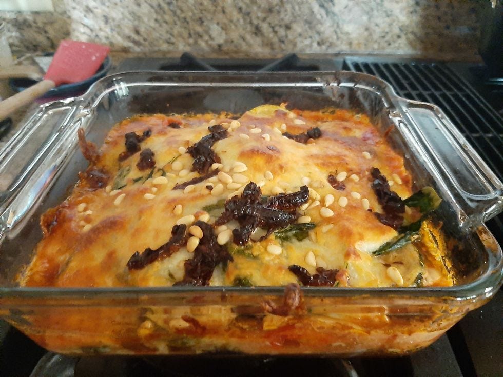 Cheesy zucchini eggplant bake!Mmmmm delicious! I added balsamic and oregano to the oil I brushed the vegetables with; added some marinara Shy made last week and a layer of spinach; and replaced the ricotta (who the fuck has ricotta?) with goat cheese (y'all all have goat cheese). Then I threw some pine nuts and sundried tomatoes from a jar on top, but they were really superfluous, I'd leave them off. Huge fucking hit. Showing one pan of two. — Bon Appetit