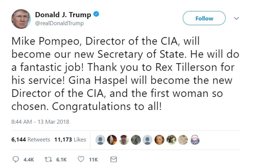 Pompeo will replace him at the State Department, and Gina Haspel — the deputy director at the CIA — will succeed him at the CIA, becoming the first woman to run the spy agency, if confirmed.