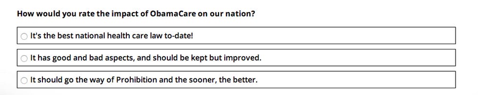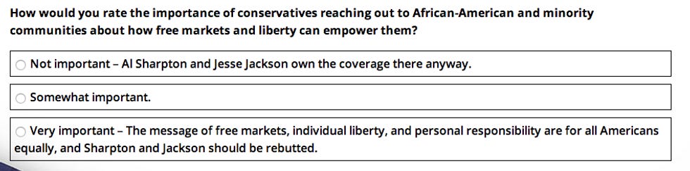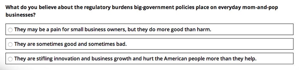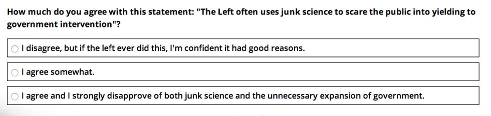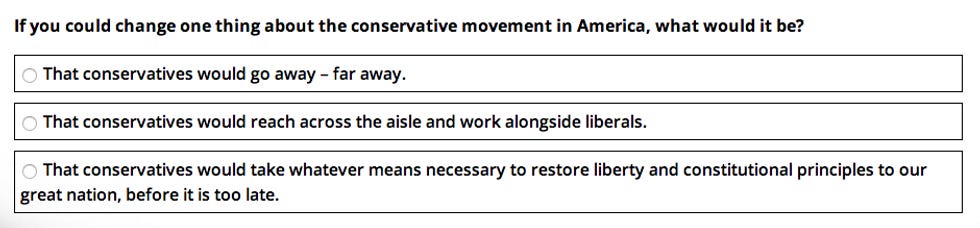 Don't worry if you get all the answers wrong. Sure, it means "you are a feckless liberal," but that's OK! The organizations offers its "condolences" and will send you "something to help put you on the right path." (Spoiler: It's a free book.)
