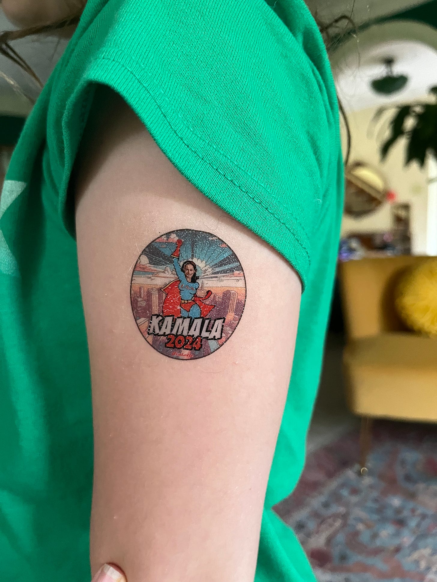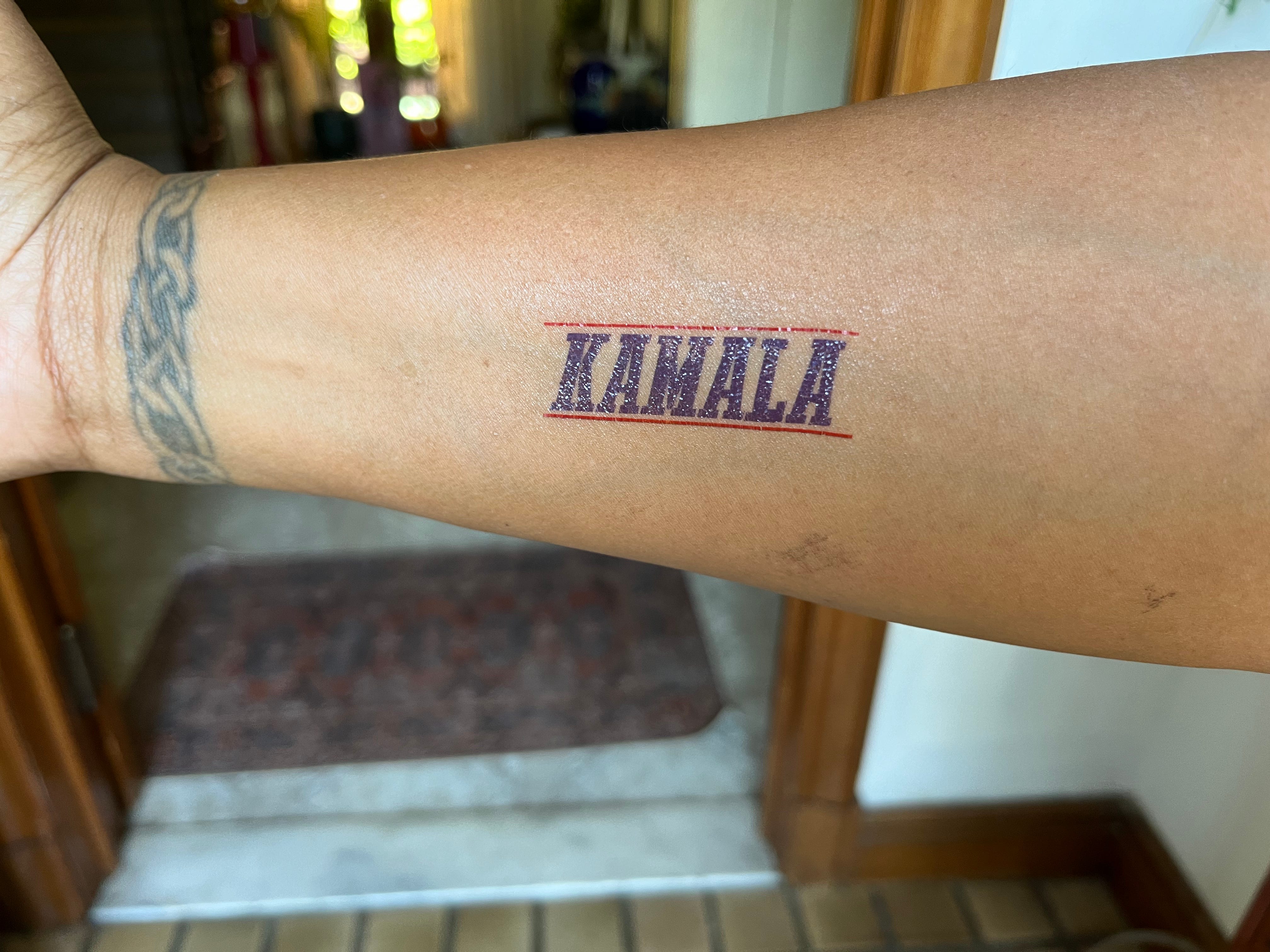 KAMALA (just the word!) tattoos are in (it costs less because it’s a tiny two inches long!); Kamala superhero is also tiny, and also in!