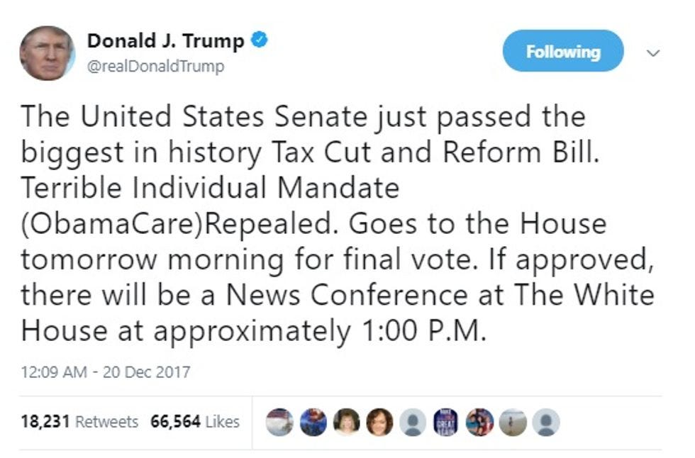 The bill passed the Senate with only Republican support, 51-48; John McCain missed the vote because he's in Arizona being treated for brain cancer. And Donald Trump is over the moon, and twote this semi-literate string of Randomly Capitalized Words: