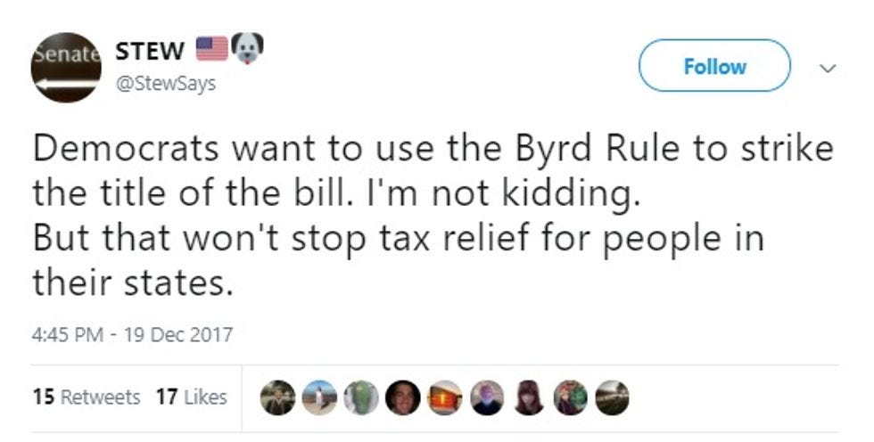 One last item that had to go didn't actually confer any special benefits on anyone, but was an important part of the GOP's propaganda around the bill: The Senate had to kill off the bill's short name, "The Tax Cuts and Jobs Act," because the reconciliation rules really don't allow any provisions that don't have an impact on the budget. The name was challenged by the office of Sen. Bernie Sanders, and the ruling gave Republicans a great big sad because now the final bill that passes will have to go by its formal title, "An Act to provide for reconciliation pursuant to titles II and V of the concurrent resolution on the budget for fiscal year 2018."