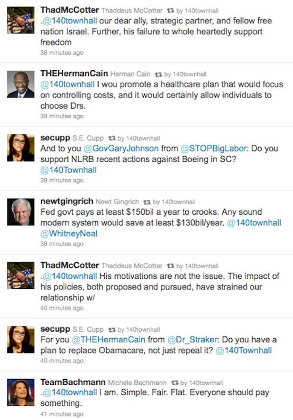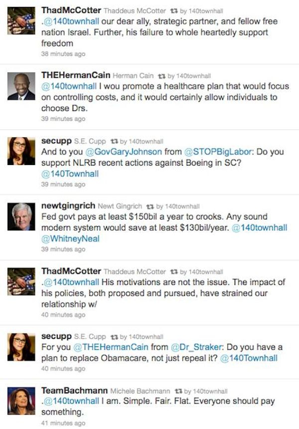 This only worked by following the group's Twitter account alone. The moderator threw out questions and retweeted every candidate's response as it came in, which if it had a sound would be that of ten thousand deaf howler monkeys screaming Ted Nugent lyrics on acid. Okay, let us find a representative sample: