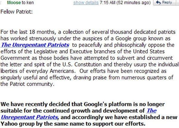 Much like the Day of Infamy when George Washington switched from AOL to Hotmail, March the Second of Year Two-Thousand and Ten will always be remembered as the day the Patriot Google group said "we hath taken too much!" and just cold went over to Yahoo groups. [ Patriotic Yahoo group ]
